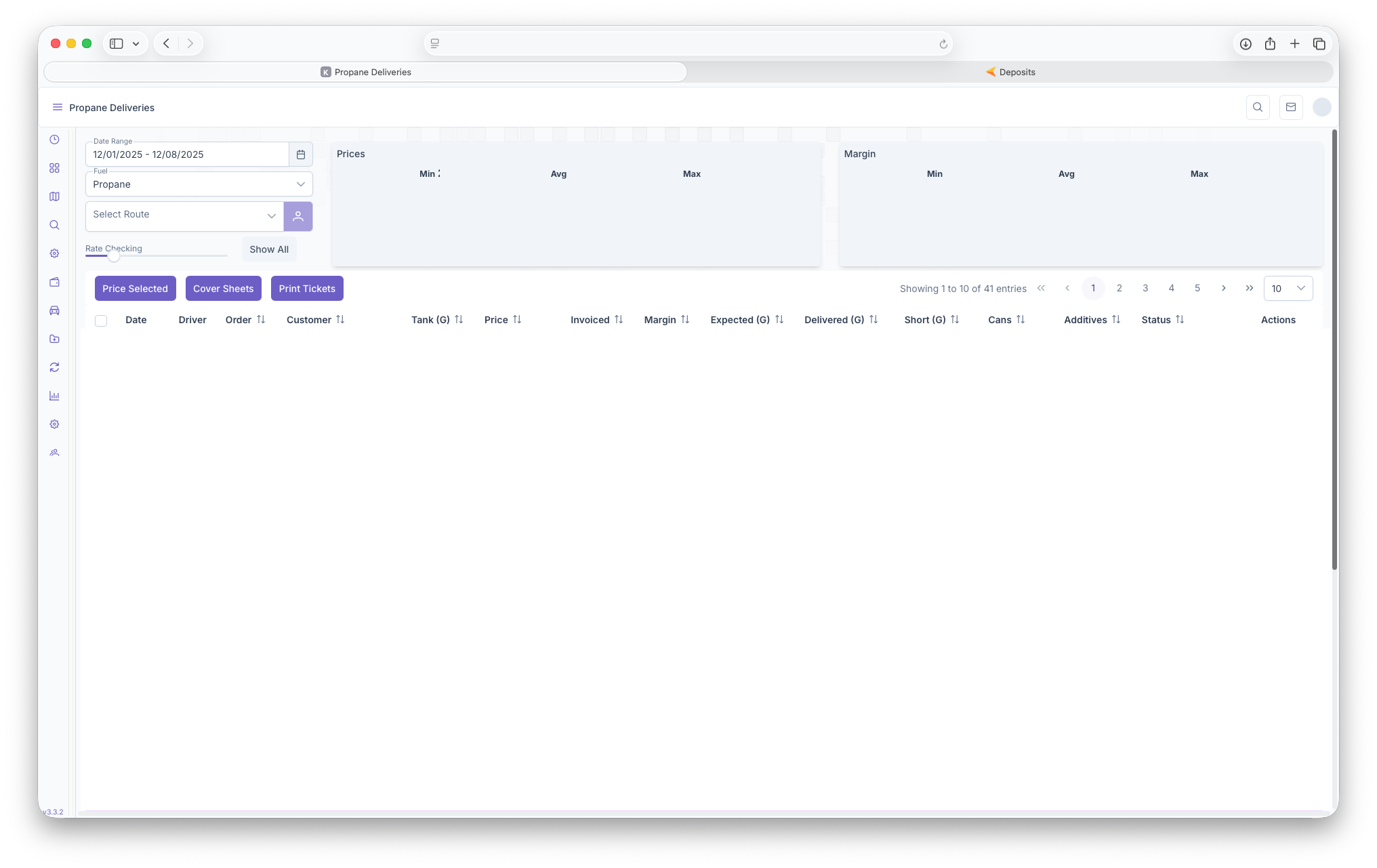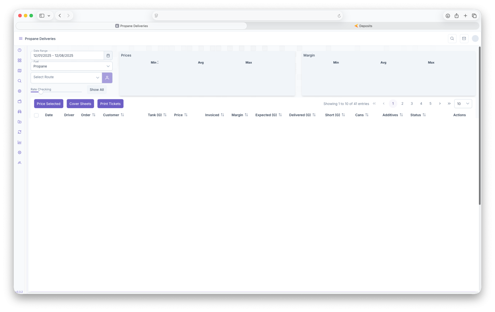The Deliveries Report page shows deliveries that have been routed and are being delievered, have been delivered, are going to be delivered or haven't been delivered. To reach the Delieveries page, on the side menu, click on the Fuel drop down, then select Deliveries. Clicking on the three bars on the top left corner of the page allows the side bar to be expanded for a more detailed view for easier access. Page can be filtered by Date Range, Fuel and Route. The page will then show Prices which show the Minimum Price, Average Price and the Max Price. The page will also show Margins that will then show the Minimum Margin, the Average Margin and the Maximum Margin. The report is then seperated into the following columns, Date, Driver, Order, Customer Number/Name, Tank, Price, Invoiced, Margin, Expected Delivery, what's been Delivered, Shortage, Cans, any Additives and current Status of the delivery. The option to price each delivery can be down by selecting a delivery and clicking on Price selected. Cover sheets and Tickets can be generated by clicking on Cover Sheets and Print Tickets buttons for easier printing and sharing
