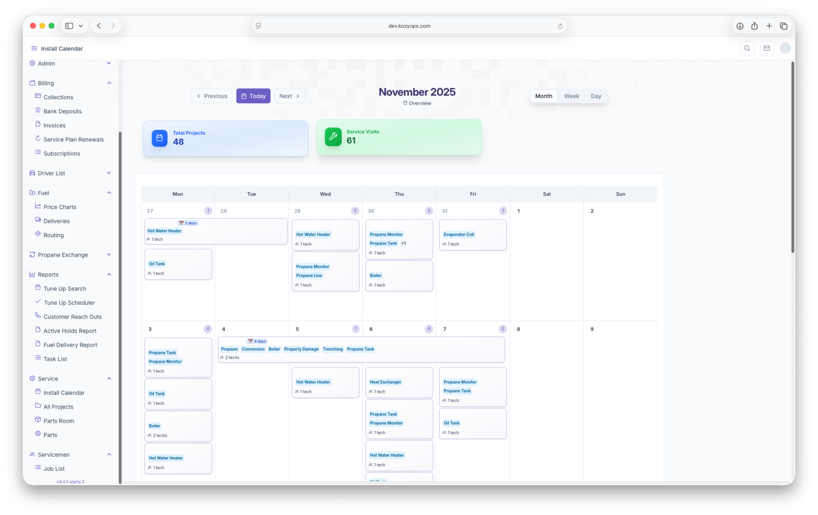 The install calendar shows projects for specific days. Can be pulled up by Month, Week or Day, then clicking Previous or Next brings up the previous or next Month, Week or Day. The page will then show Total Projects and Service Visits. The Calendar will then show Customers for specific days, what is getting worked on, and how many techs are assigned. If more detailed information is needed on each job, just click on the customer and you will be taken to the specifics of each work order