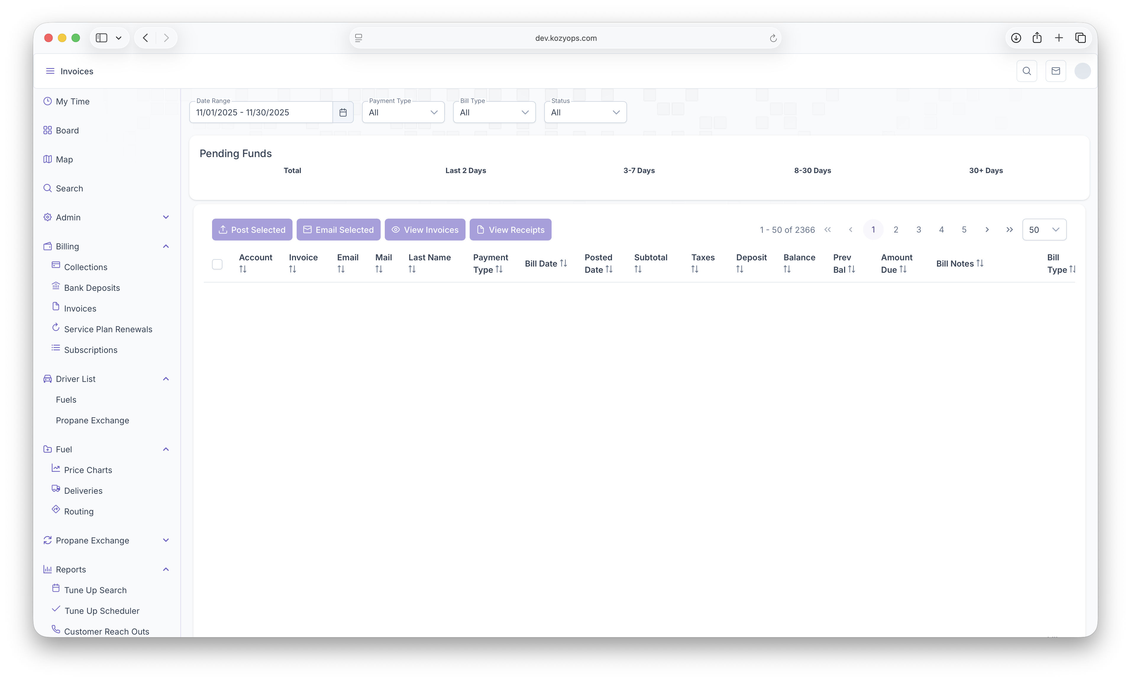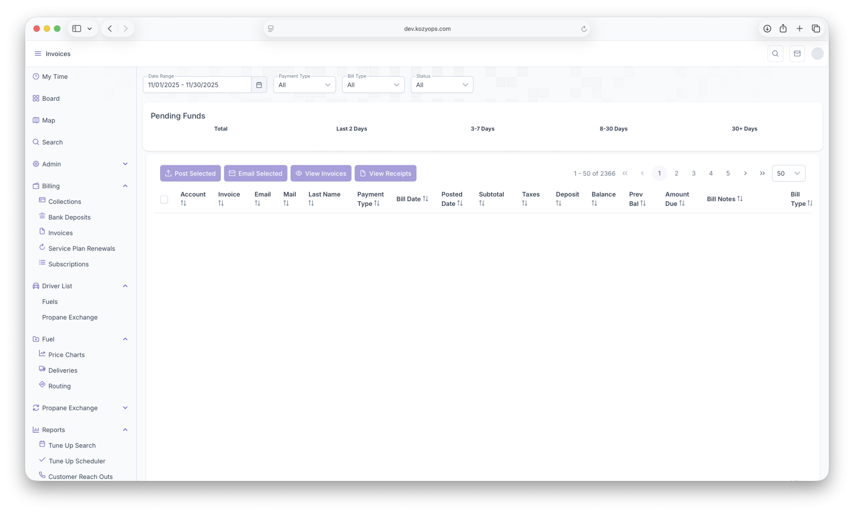 The invoices on the KozyOps App show a variety of information and a variety of ways to sort the information for convenient access. First the invoices can be pulled from Date Ranges, Payment Types, Bill Types and Status'. The invoices also show Pending Funds which are divided in total amount, the last 2 days, 3-7 days, 8-30 days and 30+ days. The following information then shows Account#, Invoice#, Customer Email, Customer Address, Payment Type, Posted Date, Subtotal, Taxes, Deposits, Balance, Previous Balance, Ammount Due, Bill Notes and Bill Type. Searches can also be sorted by the same information by clicking on the arrows next to each category type
